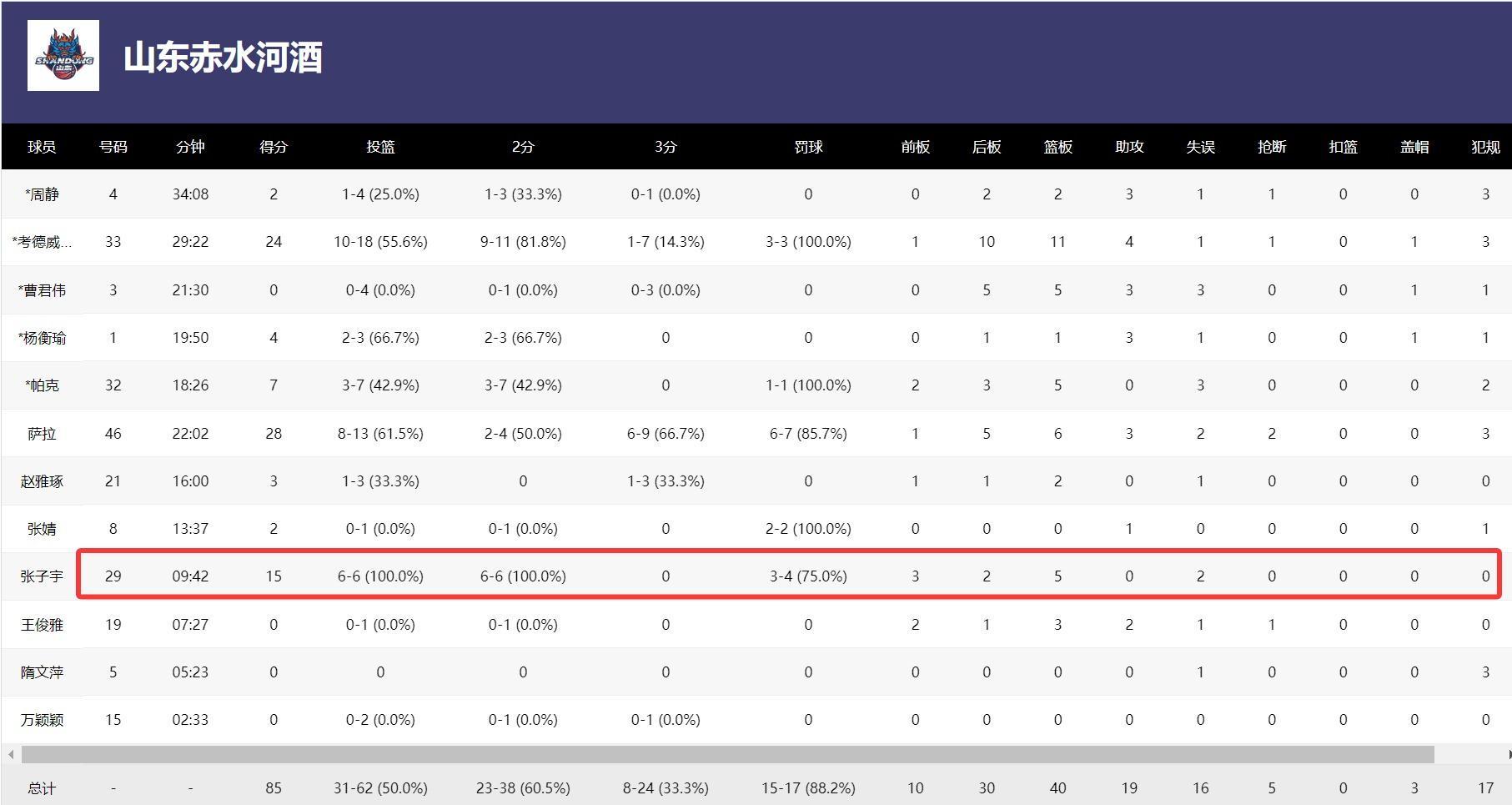 北京时间1月15日,WCBA常规赛,山东女篮85-76击败武汉盛帆女篮,这场比赛中国女篮超级新星张子宇登场9分42秒,6中6,拿到15分5篮板,命中率100%,这场比赛张子宇打出了他登陆WCBA最高效的一场比赛。9分42秒,6中6,拿到15分5篮板(3前场篮板),命中率100%。15分追平生涯新高,3个前场篮板是生涯新高,6个运动战进球也追平生涯最高,也完成...