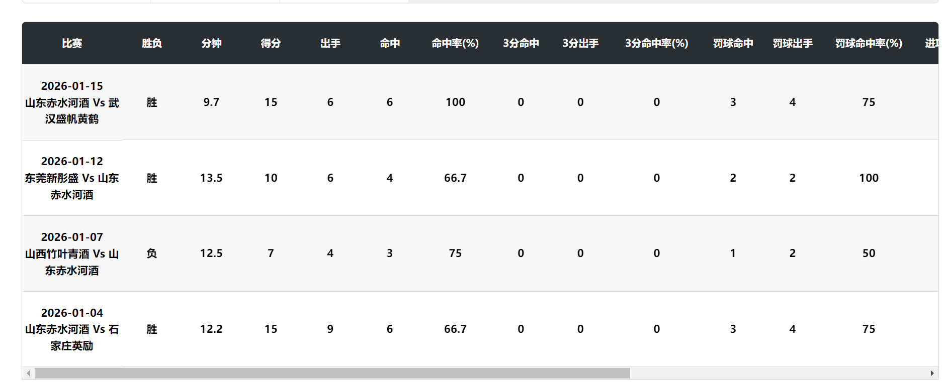9分42秒,6中6,拿到15分5篮板(3前场篮板),命中率100%。15分追平生涯新高,3个前场篮板是生涯新高,6个运动战进球也追平生涯最高,也完成WCBA生涯首场100%的比赛。