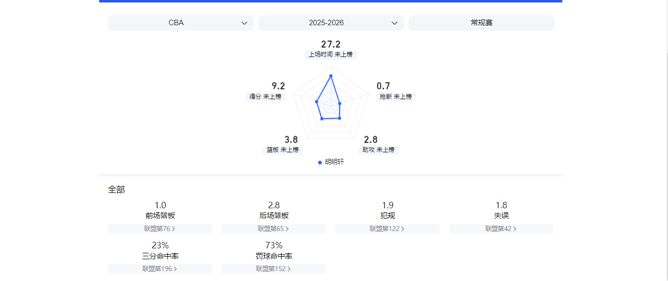 本赛季13次出场后,胡明轩的场均三分命中率只有23.8%,投篮命中率为32.2%。