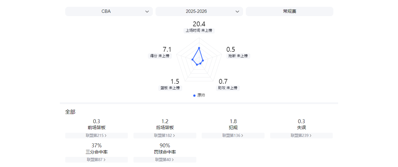 14次出场后,原帅场均三分命中率只有37.3%,场均只能为球队贡献7.1分。