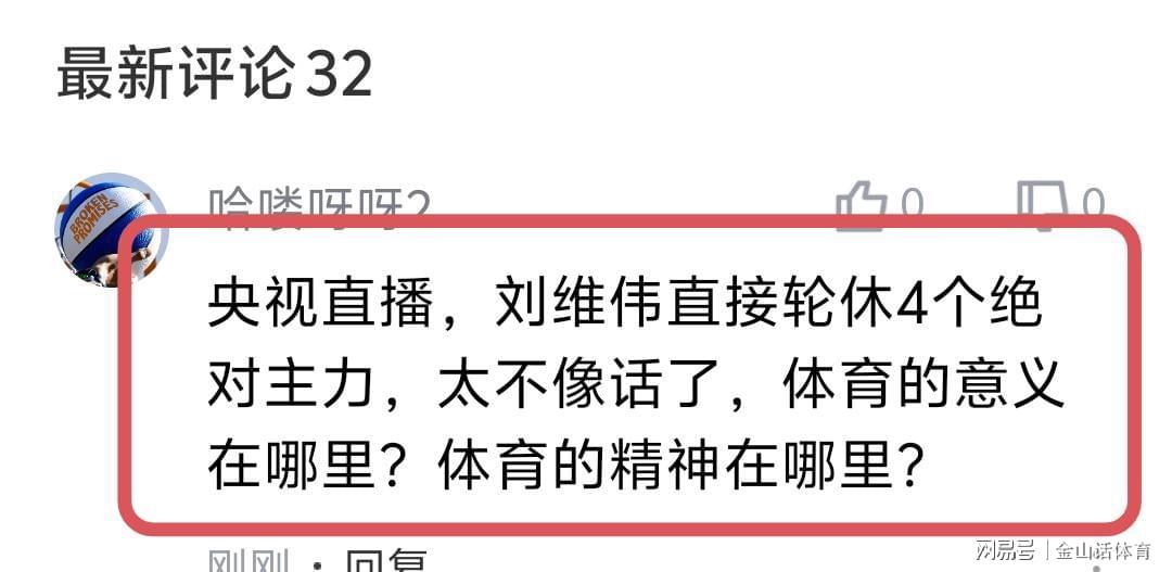 青岛队在央视直播的比赛中,“下架”4大主力,也让广大网友非常气愤,纷纷吐槽道:“刘维伟直接轮休4个绝对主力,太不像话了,体育的意义在哪里?体育的精神在哪里?”;“青岛战广厦雪藏全部主力,看似是田忌赛马的策略考量,实则既辜负了现场球迷观赛的期待,也让这场榜首梯队的对决索然无味。刘维伟的选择虽存战绩算计,却少了竞技体育该有的热血与诚意,着实不大气。”;“对谁都不够尊重,丢人”;“违背体育运动精神,对广大球迷的不尊!”;“直接缴枪,篮协应该有态度。……